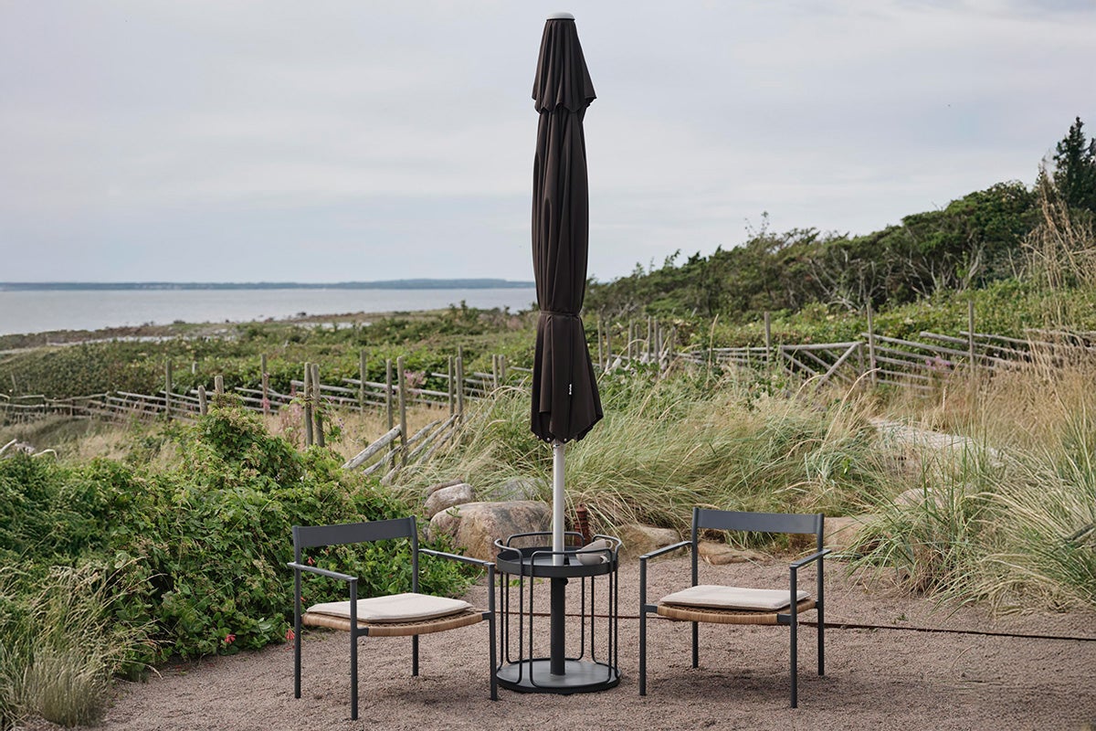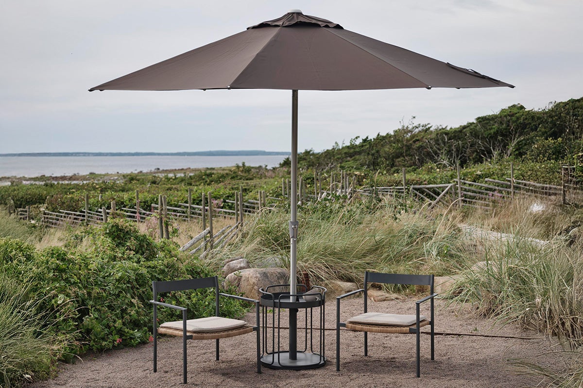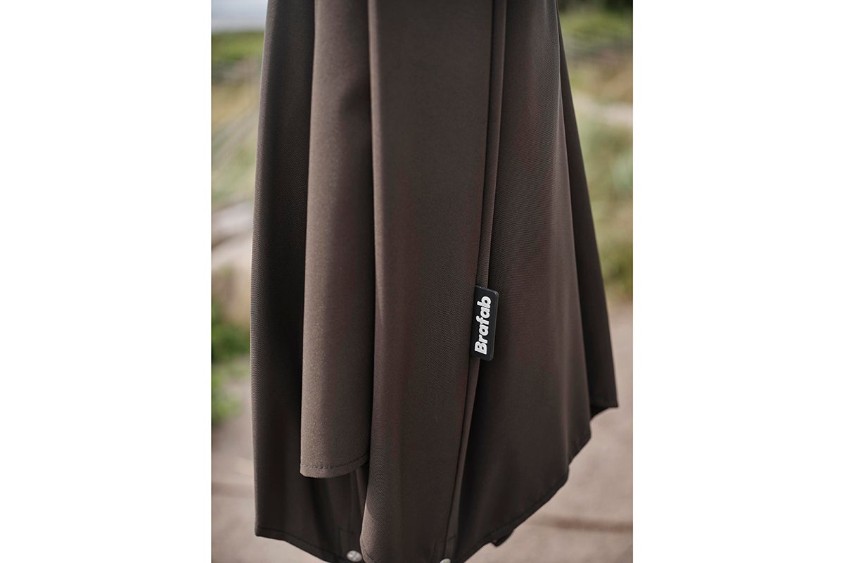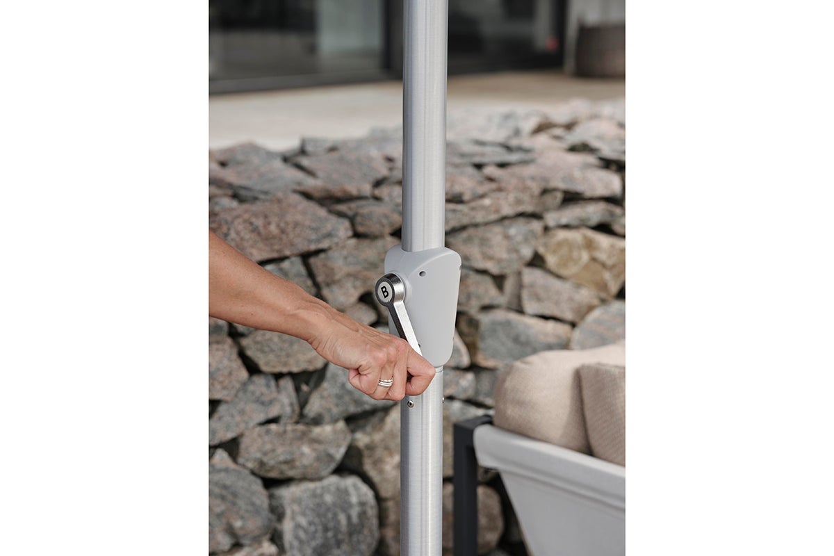 Abriola features a silver-coloured aluminum pole in two parts with a 48 mm diameter. The pole is equipped with a crank and an auto-tilt function, allowing you to easily angle the parasol. The canopy is made of 250-gram solution-dyed fabric, complete with a ventilation hole, and is supported by 8 ribs.