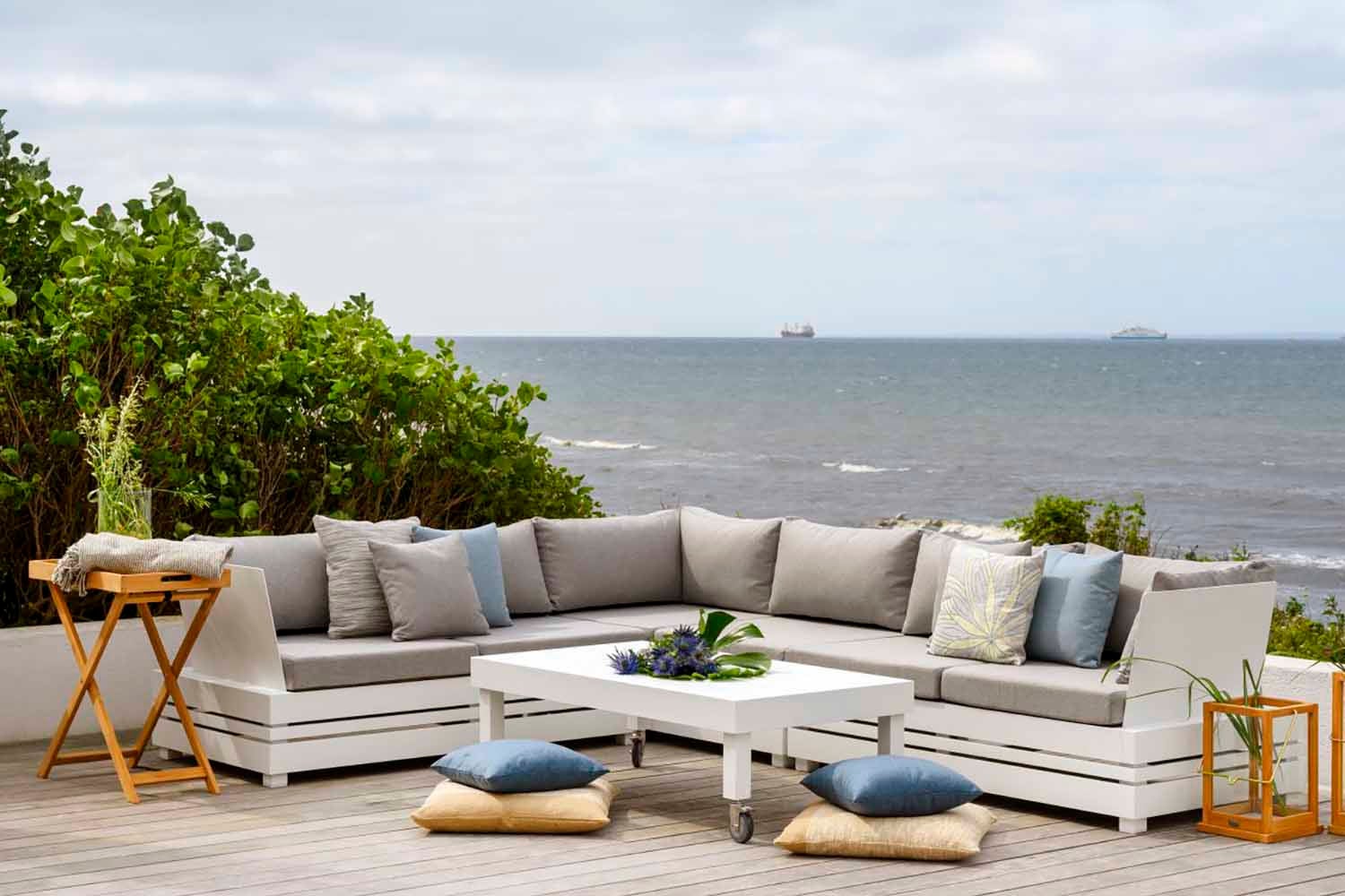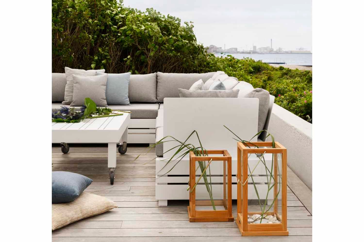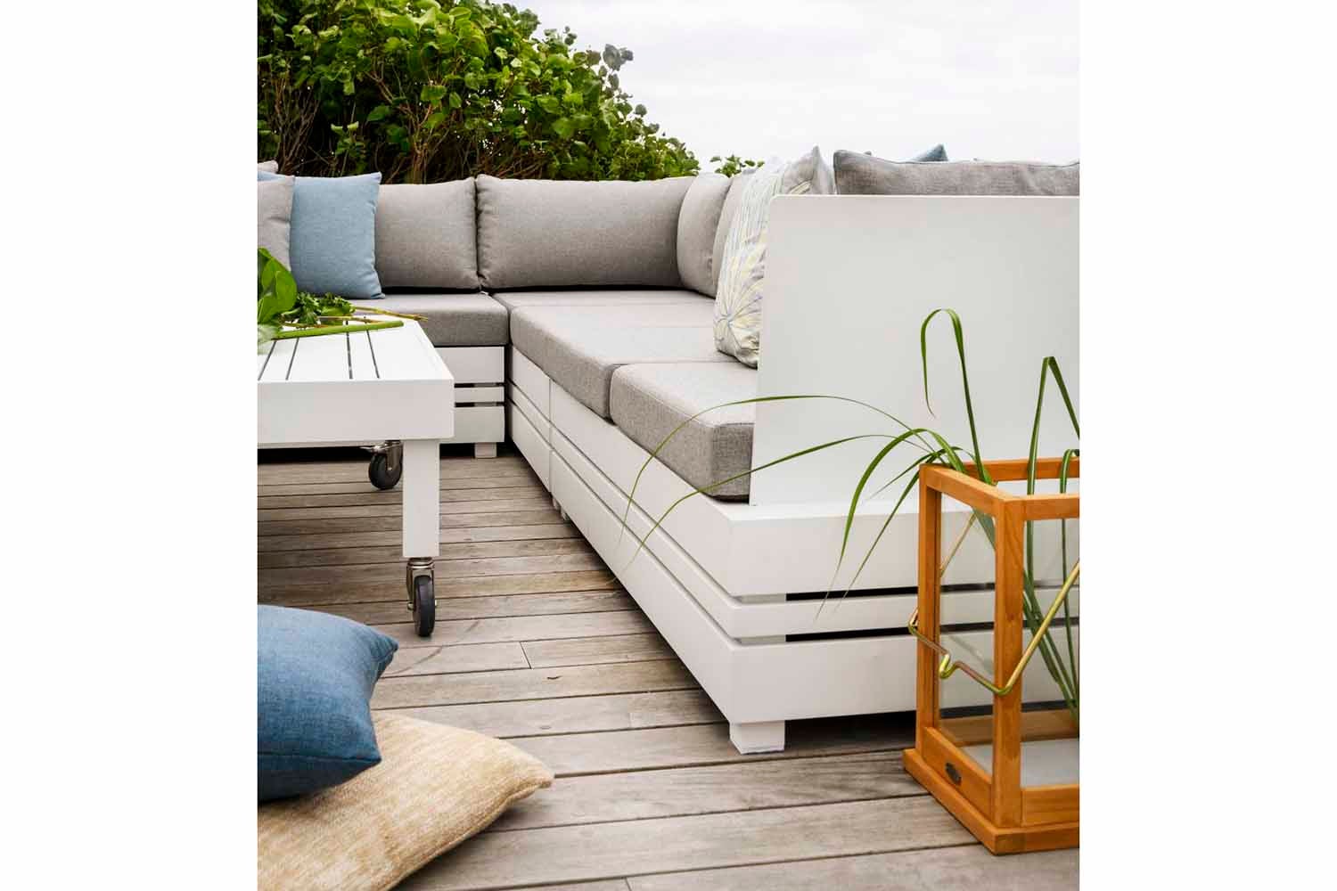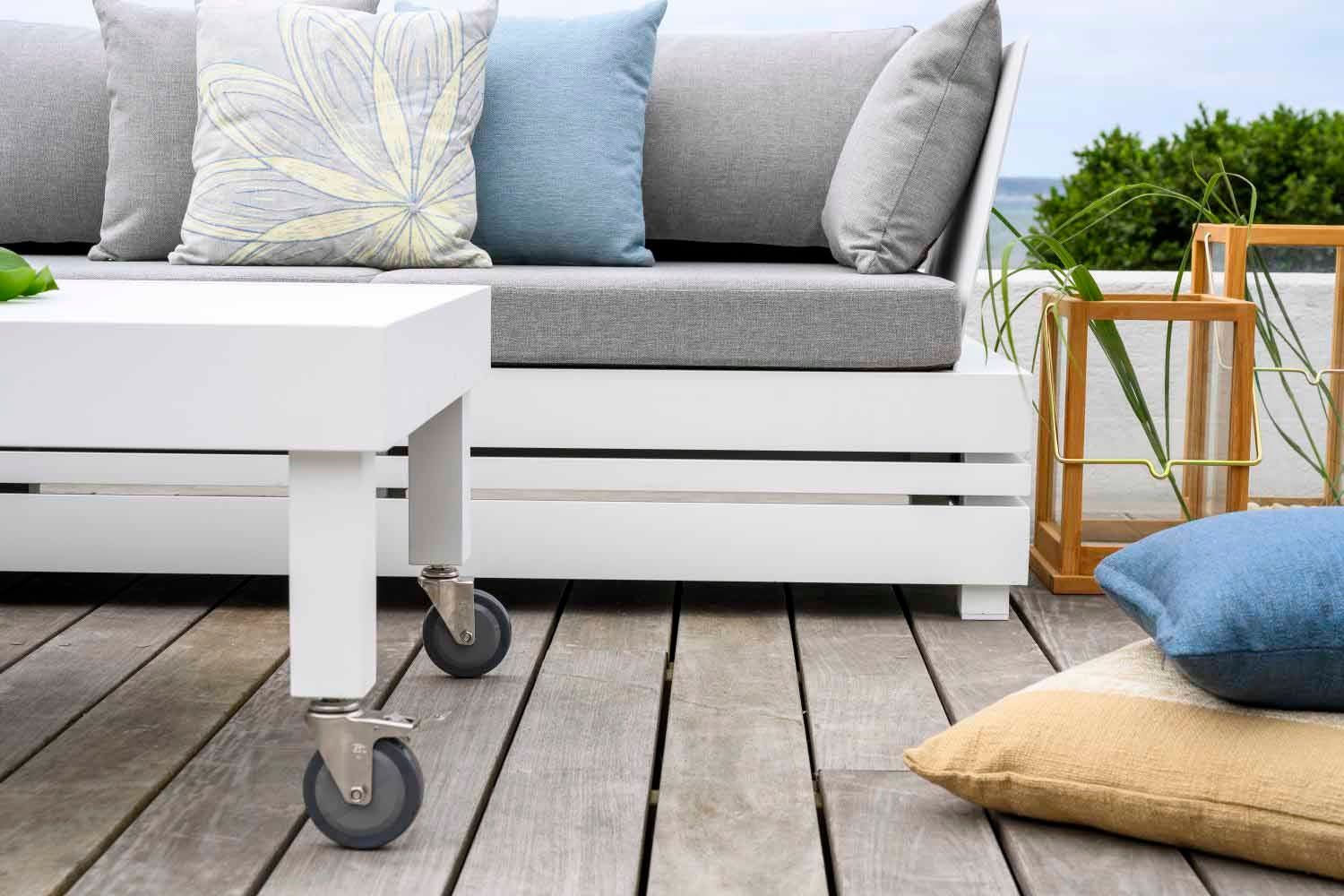 Stylish comfort with an attention to detail. Ambon is a generously dimensioned aluminium lounge group with Olefin fabric cushions. The sofa has few parts and offers excellent deep, soft seating comfort. All cushions are all-weather cushions. The coffee table was created using a unique new technology that softens sounds from the table top.