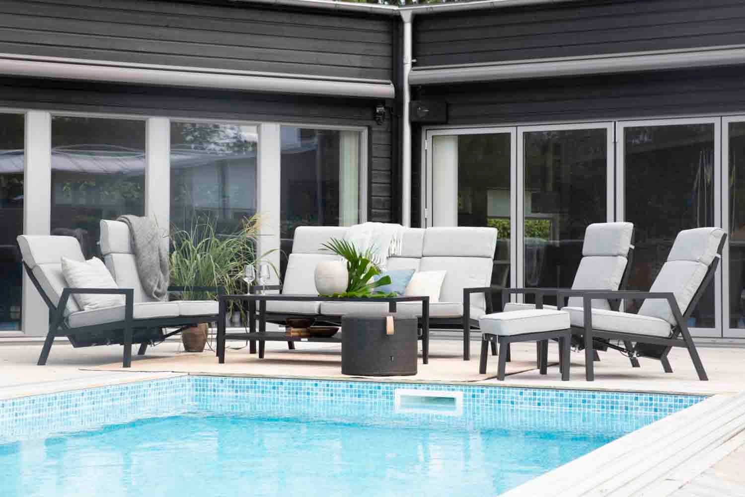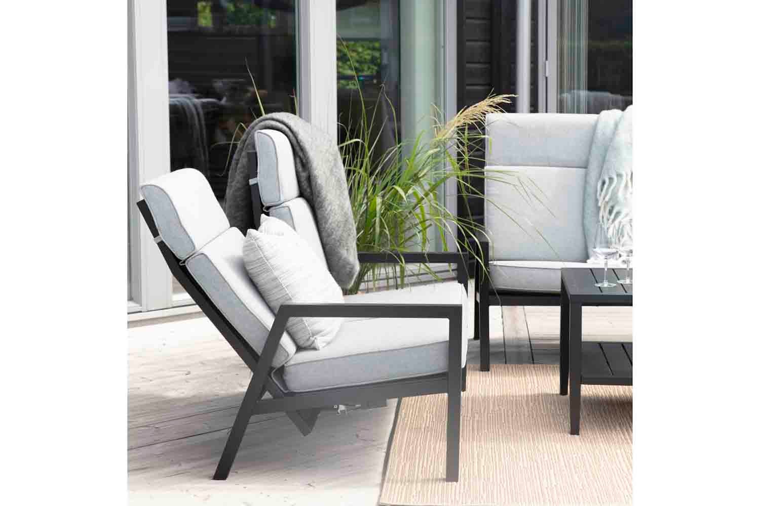 A modern lounge series providing superior seating comfort. Choose from matte white or black aluminium with grey Textilene. Top quality cushions included, in olefin fabric. The series comprises multiple separate modules, giving you the freedom to create pleasant, practical patios either large or small.