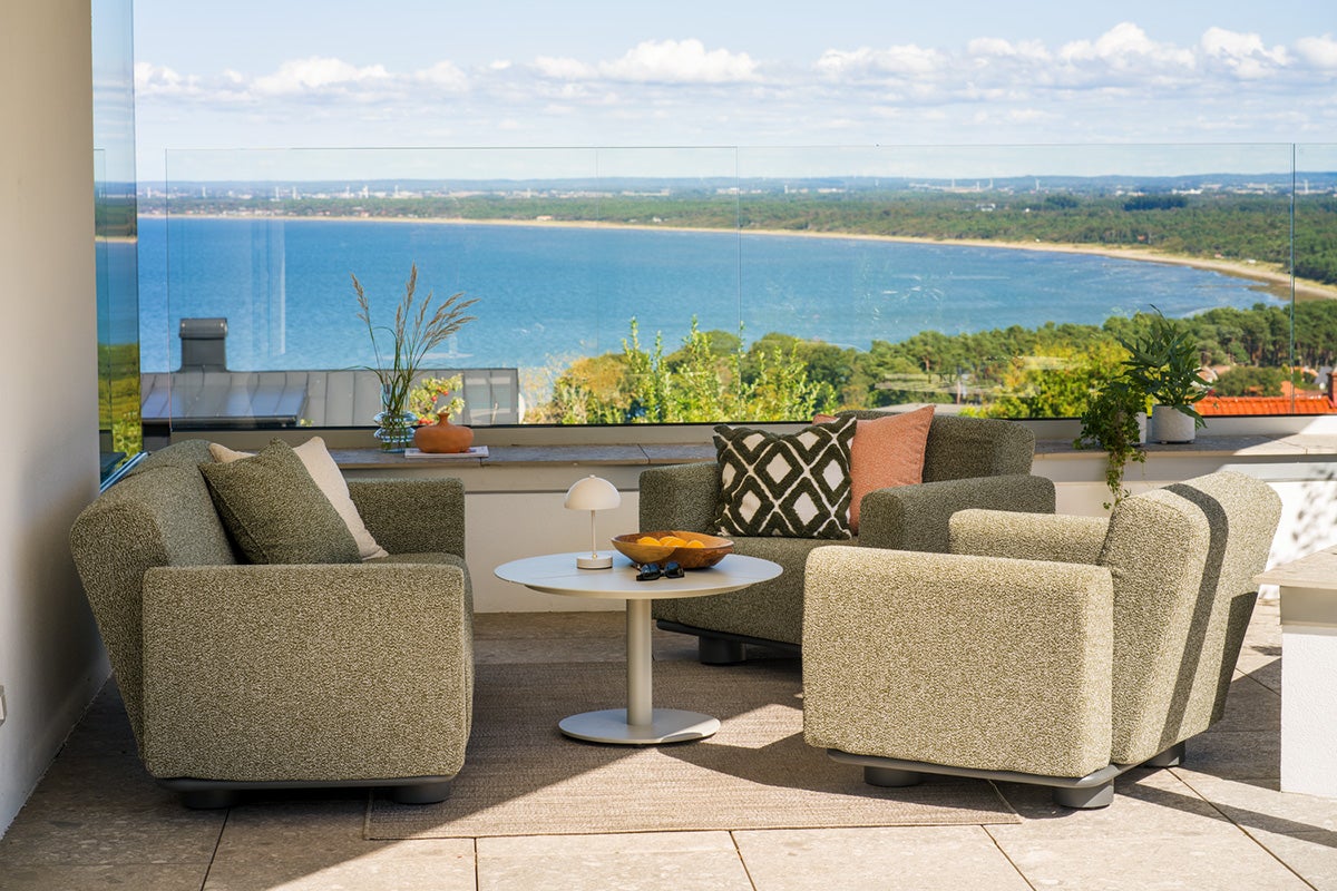 Bolster combines inviting comfort with expressive design. The fully upholstered shapes, generous cushions and chunky legs give the series its unique character, while the robust aluminium frame in anthracite ensures long-lasting durability. The water-repellent TPU fabric makes the sofa weatherproof. The cushions are available in our Teddy fabric, in colours that enhance the feeling of an exclusive outdoor lounge. The cushions are easy to remove and store. Bolster blurs the line between inside and outside – the feeling of an indoor sofa created for life outdoors.