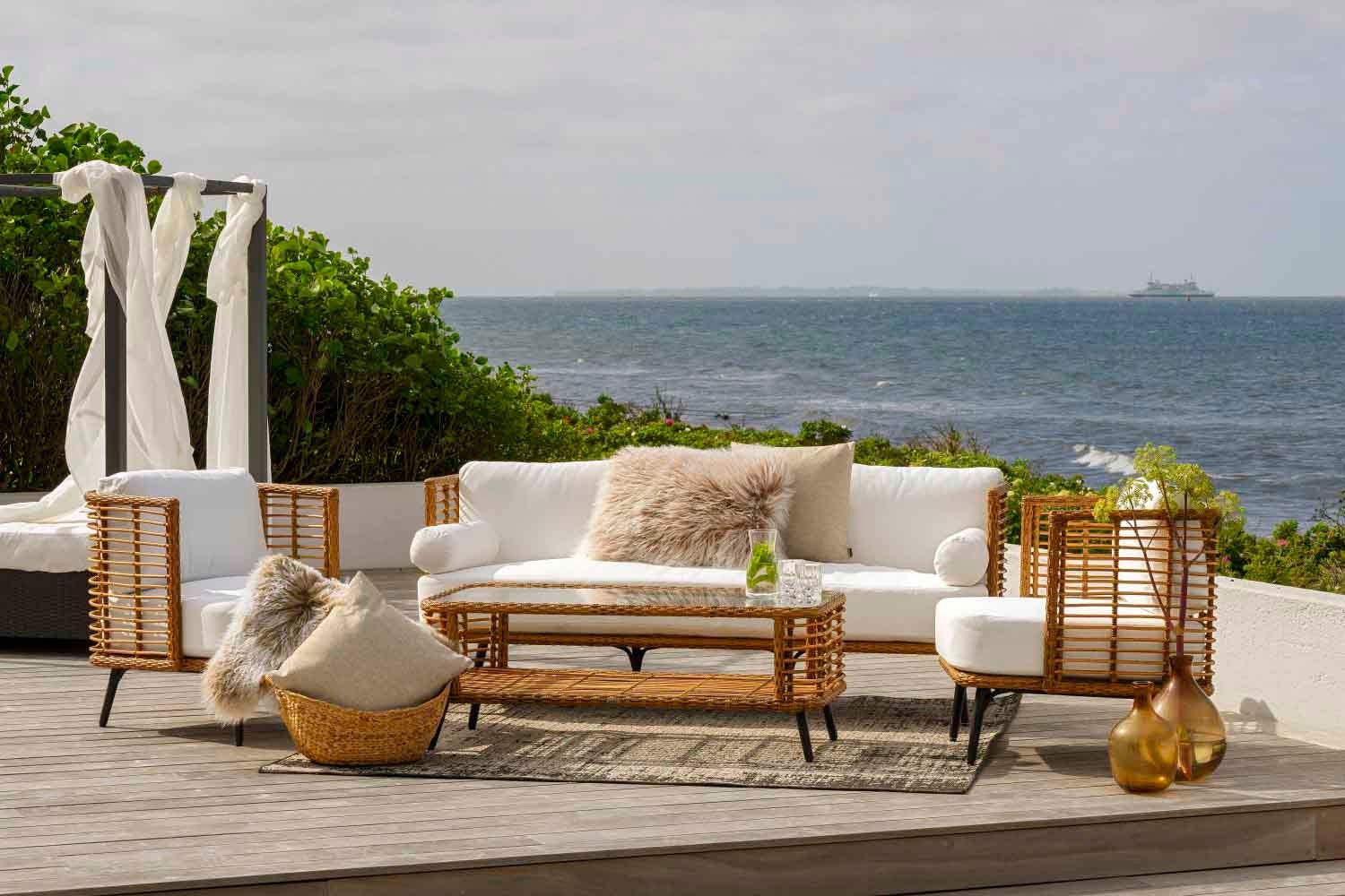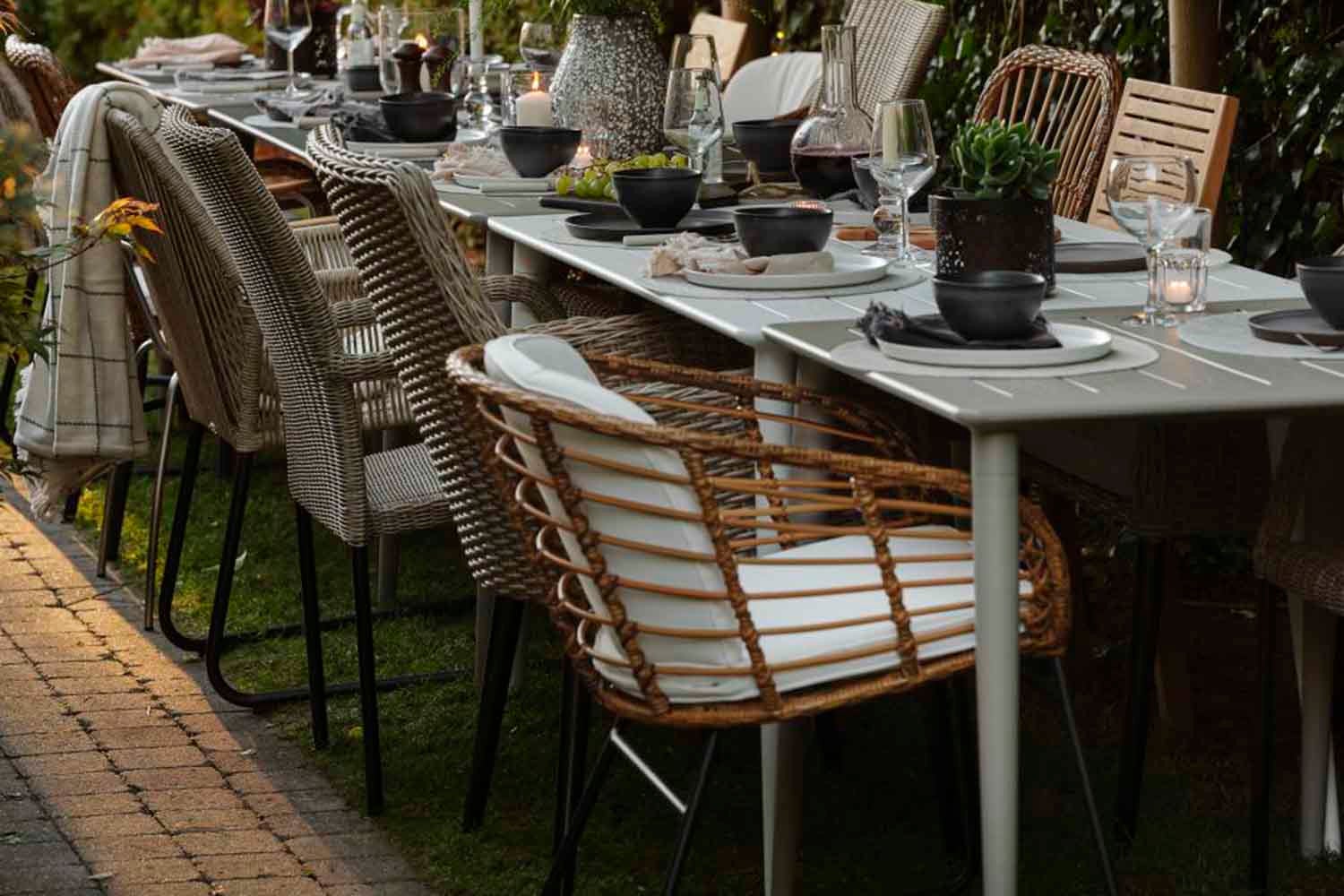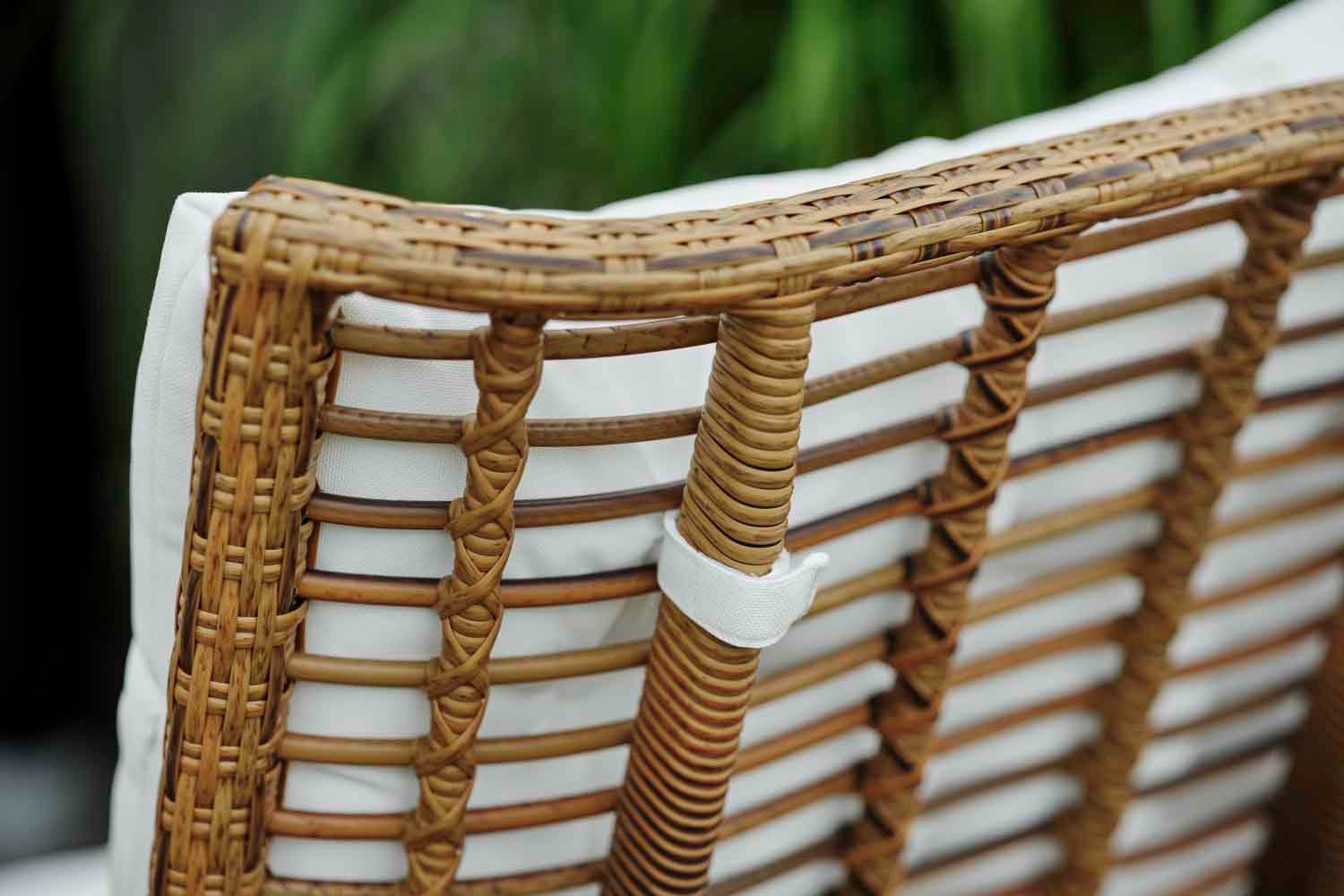 The airy, wickerwork design is made of durable, coarse artificial rattan with a very natural appearance. Excellent seating comfort and high arms create an extra snug feeling.