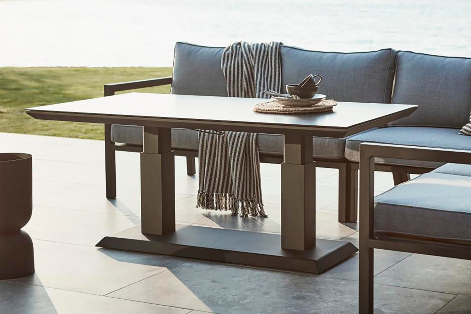 The shape of Heis is something extra. A stable, adjustable coffee table with clean lines and excellent function. The lifting structure is hidden and the height is adjusted using a slider on the underside (min height: 48 cm, max height: 68 cm). This table is suitable if you want to be able to relax in a lounge environment but also sit up and enjoy a coffee or lunch - simply a good multifunctional piece of furniture.