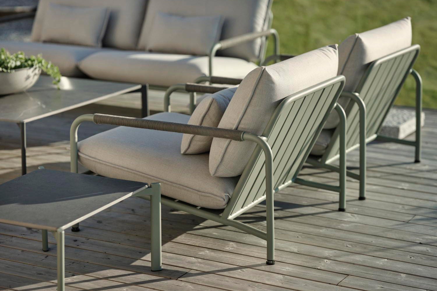 Lerberget is a premium series out of the ordinary, both in quality and design. When the best possible materials meet thoughtful design in every detail, you have a sofa set that not only draws the eye, but also sits more comfortably than ever. Stainless steel frame in two sober shades, wide decorative slats under extra comfortable cushions and beautiful details in the armrests – this group will look perfect on any patio it encounters.