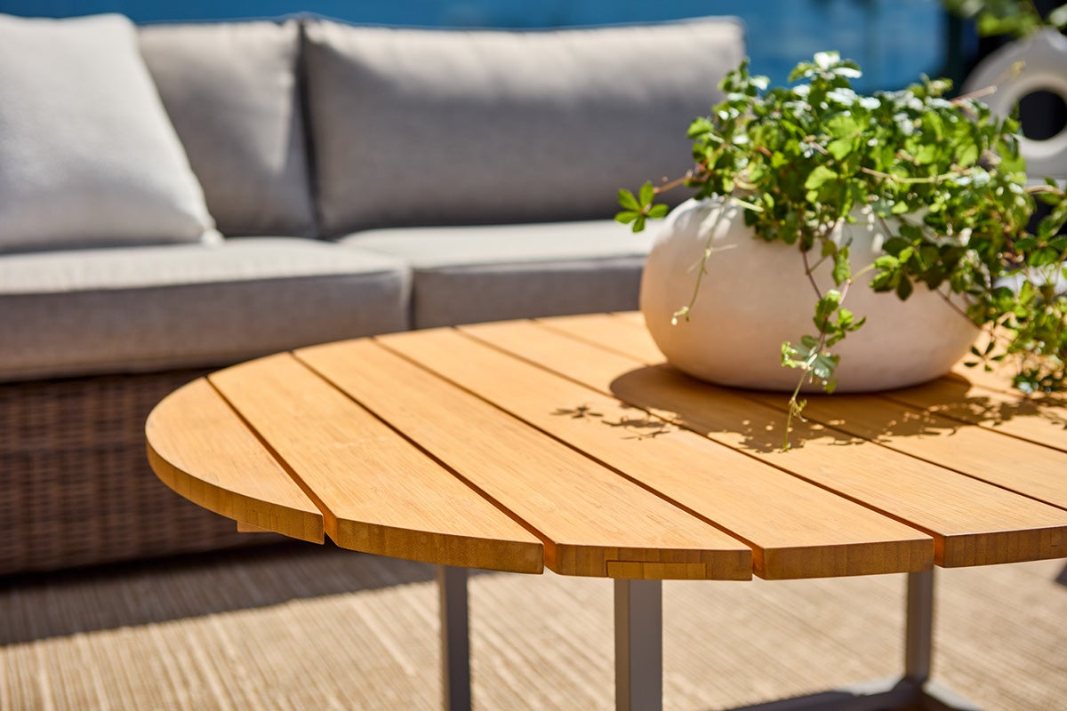 Natural shape. Steady presence. Olive is a playful and elegant table, named after the olives that inspired its shape. Aluminium frame and bamboo or aluminium top unite function and design. Adjustable feet provide stability on all surfaces. Olive fits most sofa groups and is also stylish to combine with coffee tables such as Mill or Peace Lounge.