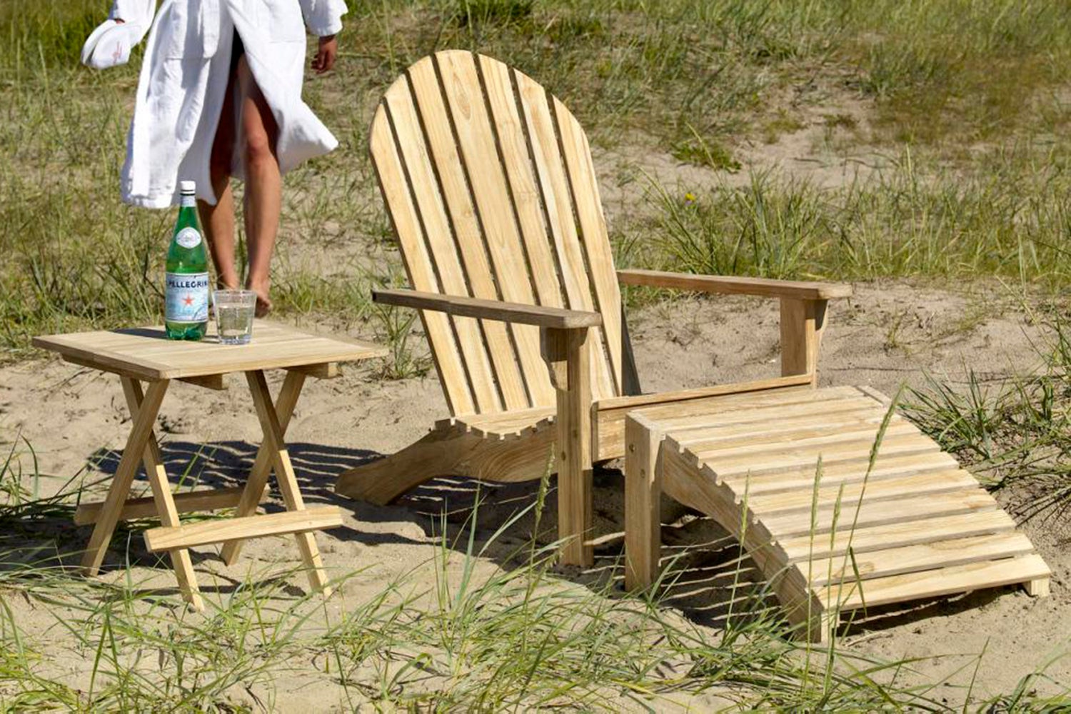 This classic Adirondack reclining chair and the small square folding table in white-pigmented teak make the perfect match.