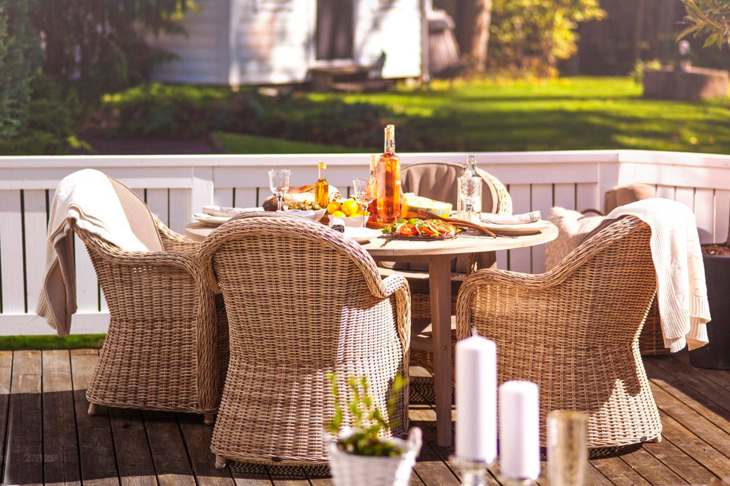 Our classic Paulina, cozy and comfortable furniture made of 5.3 mm round artificial rattan braided on an aluminum frame. Glass panels for the tables and cushions in olefin fabric for the seating furniture are included.
