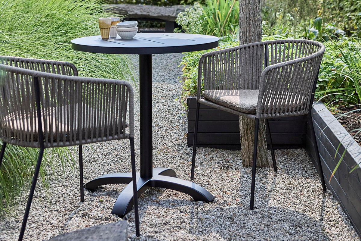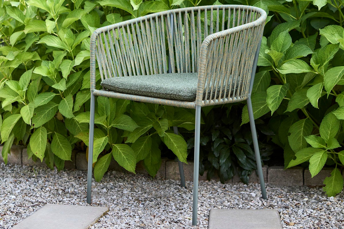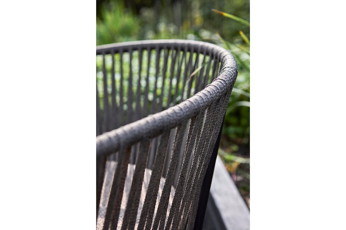 The Piatto dining chair combines comfort and durability with its robust steel frame, designed to endure the demands of outdoor use while ofering modern sophistication. The seat and back are crafted from broad, intricately woven ropes that provide exceptional support and add a touch of artisanal elegance to any outdoor setting. An included seat cushion enhances the overall comfort.
