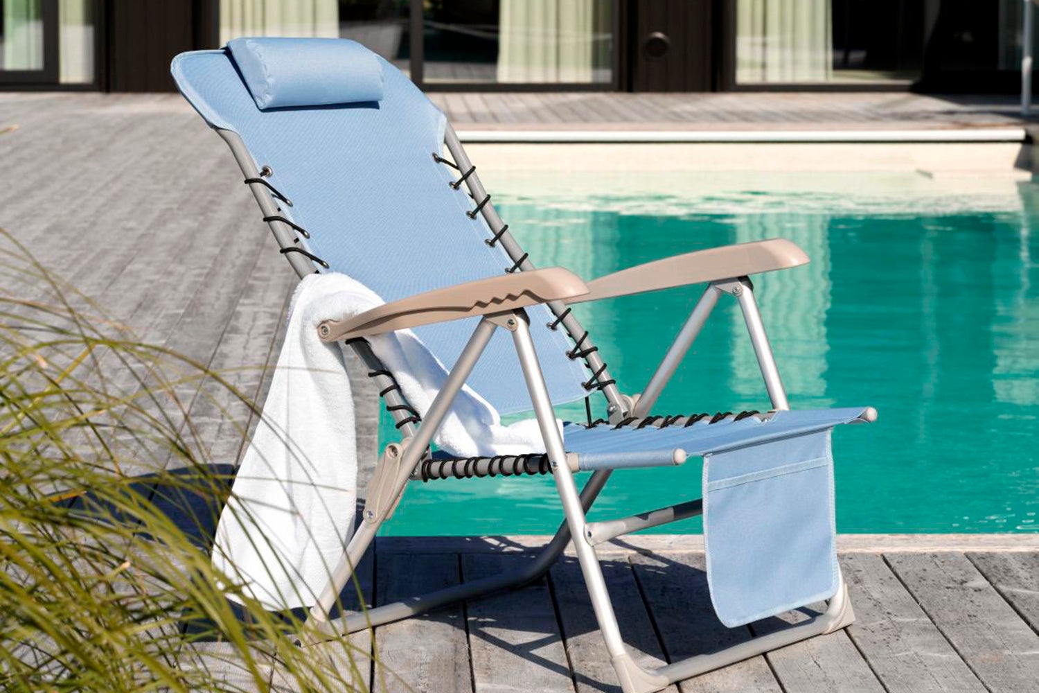 Neat and stable beach chair with an aluminum frame combined with durable polyester. Front pocket.