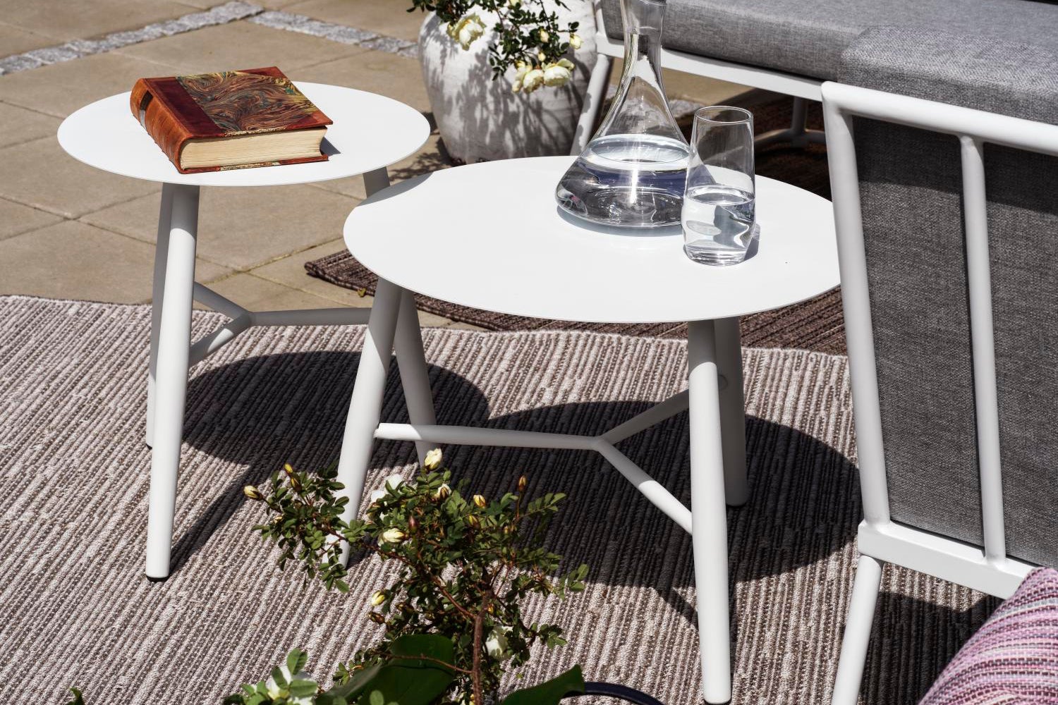 The sleek and sturdy aluminum tables offer a modern interpretation of traditional design. The table legs are elegantly rounded and placed in a cross formation, perfect for resting your feet on. You can choose between three different sizes and two different heights, making it easy for you to adapt them to the needs of your home.