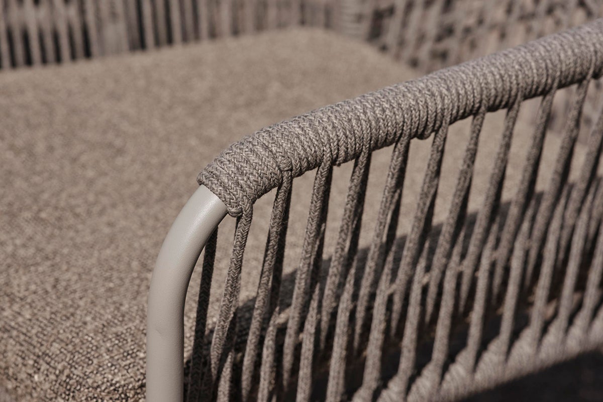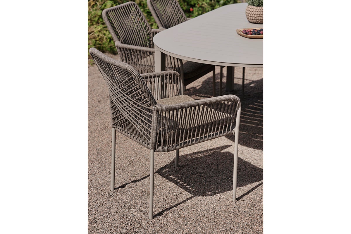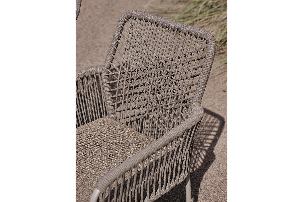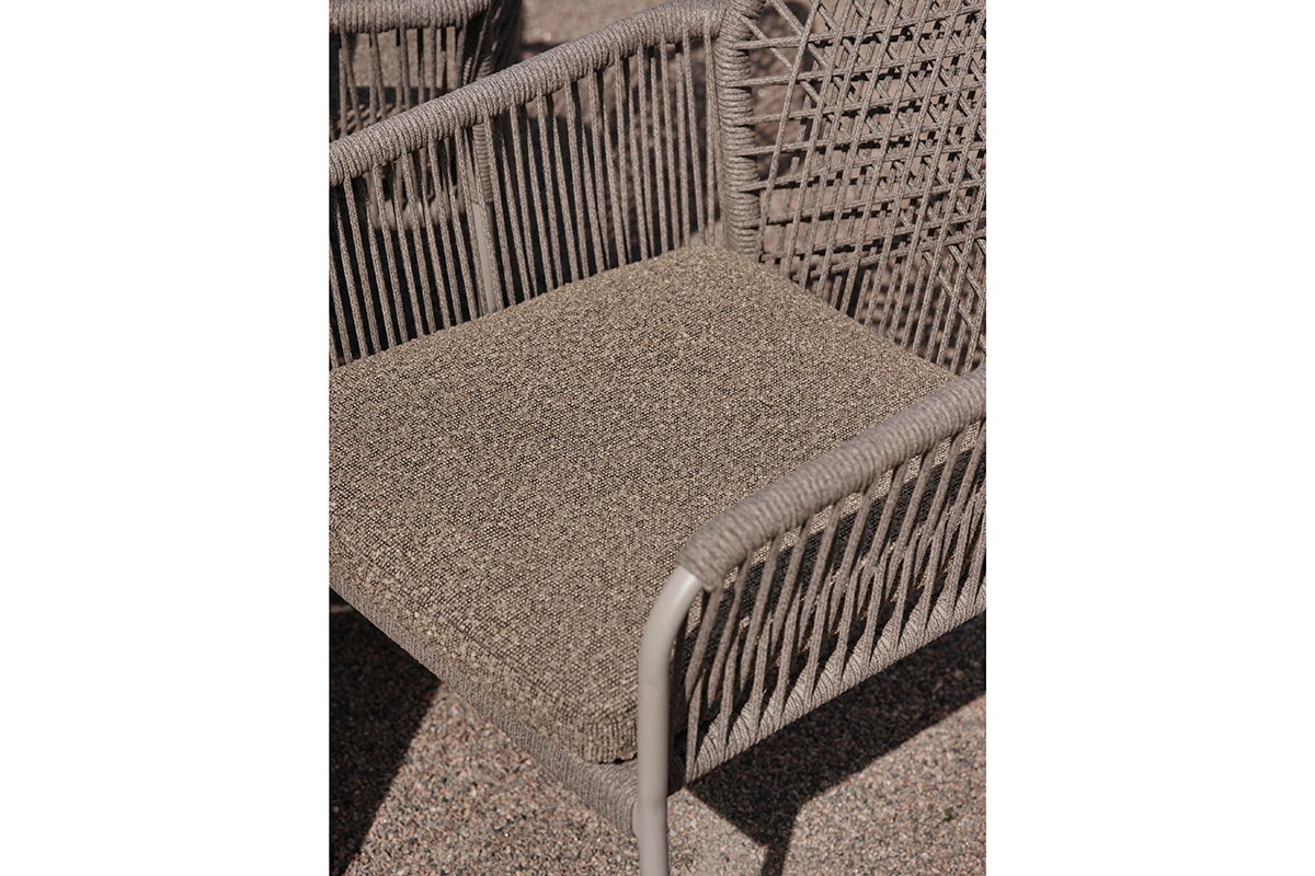 This comfortable dining chair features a woven rope design that efortlessly withstands the elements. The steel frame ofers sturdy support while resisting rust and corrosion, ensuring long-lasting enjoyment in any climate. The intricately patterned rope seat and back add a touch of organic beauty with their earthy tones, inviting you to relax and unwind. Seat cushion is included for added comfort.